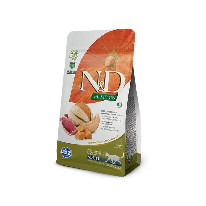 Kačacie mäso, tekvica a melón Cantaloupe. Kompletné krmivo pre dospelé mačky.