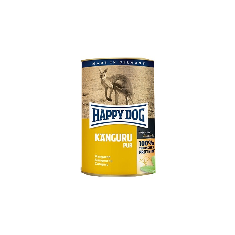 Konzerva HAPPY DOG Känguru Pur sa vyrába výhradne iba z čerstvého klokanieho mäsa, bez sóje a bez rastlinných prísad a takisto bez umelých farbív a konzervačných látok.